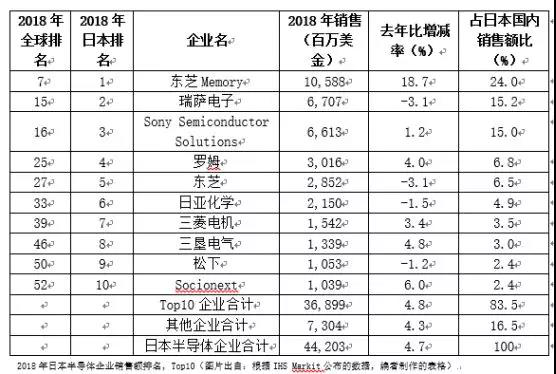 IHS Markit于日前公布了2018年第四季度全球半導體企業(yè)排行,此次,根據對IHS Markit采訪,獲悉了2018年日本主要半導體企業(yè)的排名。據數字顯示,2018年日本半導體企業(yè)整體的銷售額比2017年增加了4.7%,達到442億美金(約人民幣3,006億元)的規(guī)模,帶動這一增長的是位于Top1的東芝Memory(以下簡稱東芝存儲)。東芝存儲2018年的銷售額為105億8,800萬美金(約人民幣720億元),比2017年增加了18.7%,是日本國內Top10中唯一達到兩位數增長率的企業(yè)。另外,在Top10中負增長的企業(yè)有四家,分別是,第二位的瑞薩電子、第五位的東芝、第六位的日亞科學、第九位的松下。