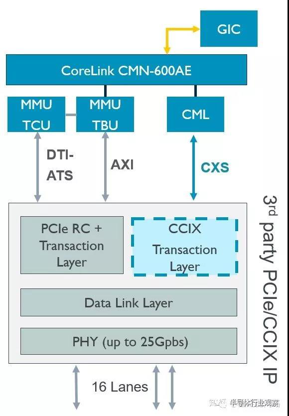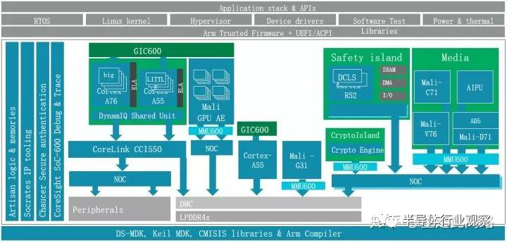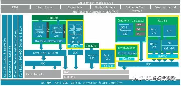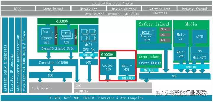 CMN600AE作為橋梁,連接了所有設(shè)備,并提供高帶寬,硬件一致性以及系統(tǒng)緩存。受布局布線的限制,還是需要NoC把帶寬和延遲需求不高的設(shè)備通過(guò)子網(wǎng)連到CMN600AE。