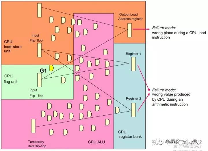 這里,IP模塊被劃為存取單元(A門),標(biāo)志單元(B門),計(jì)算單元(C門)和寄存器組(D門)。從輸出端看,于上一級(jí)寄存器間連線所覆蓋的組合邏輯為門數(shù),一個(gè)寄存器算10個(gè)門。如上圖,存取單元的地址寄存器輸出受24個(gè)組合邏輯門外加2個(gè)寄存器的影響,那共存在44種單點(diǎn)錯(cuò)誤會(huì)引起失效。依此類推,寄存器組的1號(hào)輸出,受28個(gè)門影響,而2號(hào)受49個(gè)門影響。加起來(lái)總共121種可能。簡(jiǎn)單計(jì)算可知,存取單元失效率44/121=36.4%,寄存器組合計(jì)77/121=63.6%。是其中有些門被統(tǒng)計(jì)了多次,比如圖中的G1,這一點(diǎn)會(huì)反映在總的概率里面。