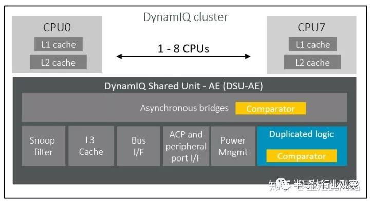 新的A76AE是Armv8.2架構(gòu),如上圖所示,一個(gè)處理器組之內(nèi),包含了DSU做三級(jí)緩存和內(nèi)部互聯(lián)。和核心部分不同,這里采用的是傳統(tǒng)的鎖步模式,只復(fù)制邏輯,內(nèi)存還是一份。省了大面積的緩存開(kāi)銷。通常DSU里面邏輯只占很小一部分,并且面積利用率還很低,所以最終額外的面積并不大,15%左右。