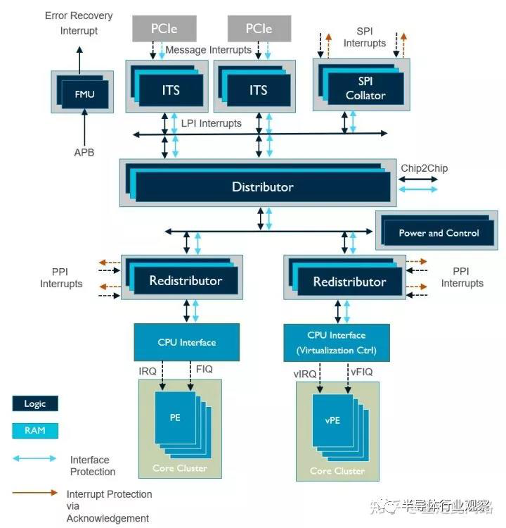 再來(lái)看看中斷控制器GIC600AE。以AE結(jié)尾的IP表示在原有的基礎(chǔ)上做了功能安全設(shè)計(jì),可以支持到Asil-D。GIC600AE結(jié)構(gòu)如下圖: