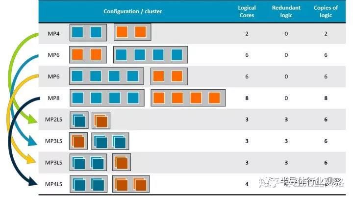 下圖是輔助駕駛芯片里A76AE和A65AE的各種組合。在汽車上,尤其是在輔助駕駛的領(lǐng)域,同樣存在同時(shí)需要大小核的場(chǎng)景:大核跑決策,單線程性能要求高;小核跑計(jì)算,能效比要求高。