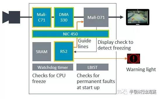 黃色框內(nèi)作為儀表盤處理器的A55,很難被替換成R52,因?yàn)閳D形處理器通常需要支持MMU的操作系統(tǒng)。此處的操作系統(tǒng),可以是Asil-B/D級(jí)的QNX等,也可以是Asil-B/D級(jí)虛擬機(jī)之上建立的實(shí)時(shí)操作系統(tǒng)。另一方面,A55雖然有ECC和RAS機(jī)制,但并不支持鎖步,很難做到通用場(chǎng)景下的Asil-B等級(jí)。至于同樣被隔離的圖形處理器G31,更沒(méi)有安全設(shè)計(jì)。那怎么把儀表盤做到Asil-B?一旦發(fā)生故障,比如儀表盤畫不出正確的圖層,或者干脆不響應(yīng),我們可以把A55和G31排除在安全狀態(tài)之外,讓R52驅(qū)動(dòng)外置LED燈告知駕駛員錯(cuò)誤信息。這樣,就把問(wèn)題歸到了怎樣用Asil-D級(jí)的安全島探測(cè)錯(cuò)誤。這個(gè)就相對(duì)要簡(jiǎn)單多了??梢杂?jì)算每一幀r的CRC,看看是不是連續(xù)幾幀不變;也可以定期讓A55響應(yīng)中斷或者喂狗,又或者同時(shí)采用。