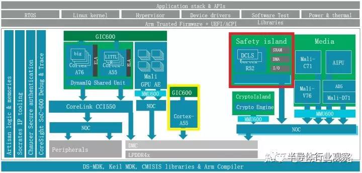 讓我們回頭看看上面的中控芯片結(jié)構(gòu)圖。最重要的是紅色框內(nèi)的安全島,由R52和緊耦合內(nèi)存,中斷控制器,總線,內(nèi)存控制器,以及DMA控制器,硬件鎖,SRAM等組成。理想情況下,每一個(gè)模塊都需要是Asil-B/D的。如果做不到,那么至少R52,緊耦合內(nèi)存和硬件鎖做到。由它們構(gòu)成安全的基石,用來(lái)輪詢其余模塊是否發(fā)生故障。同時(shí),這個(gè)安全島還可以作為系統(tǒng)控制器,來(lái)控制其余模塊的電源,電壓和時(shí)鐘狀態(tài);否則,還需要一個(gè)Asil-B/D的電源管理的有限狀態(tài)機(jī)來(lái)做這件事情,具體可以參考CMN600AE里時(shí)鐘,P/Q通道和重置信號(hào)的設(shè)計(jì)。