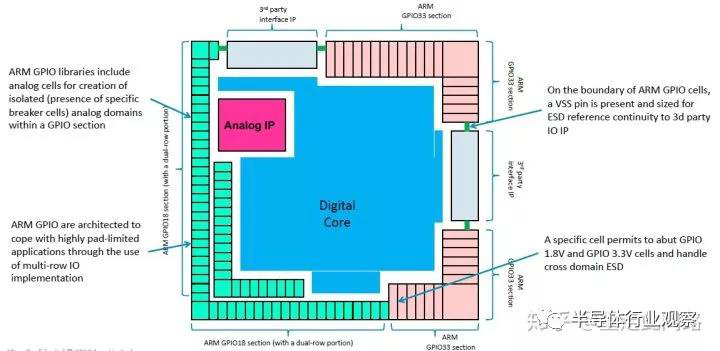 上圖是集成在芯片內(nèi)部的GPIO,集成時(shí),除了要插入一些特殊的單元來(lái)完成不同電壓的IO模塊隔離,還需要注意一定的IO上電次序。