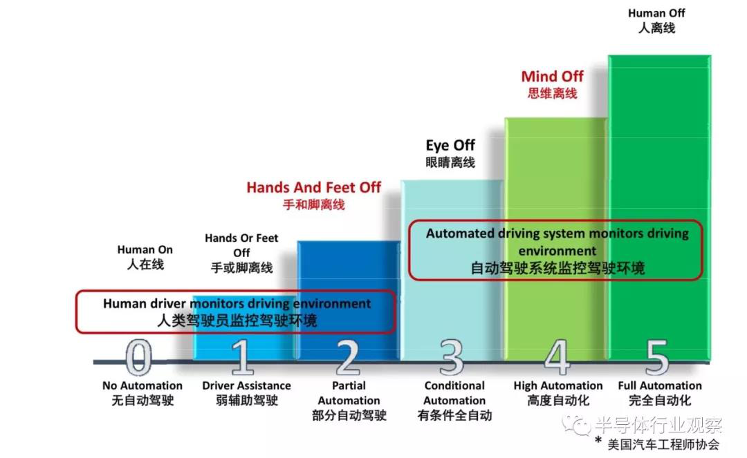 根據(jù)美國汽車工程協(xié)會的劃分標(biāo)準(zhǔn),自動駕駛目前可以分出6個(gè)等級(如圖所示):L0:無自動駕駛,L1:弱輔助自動駕駛,L2:部分自動駕駛,L3:有條件全自動駕駛,L4:高度自動化駕駛,L5:完全自動化駕駛。