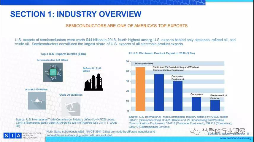 2018年,美國半導(dǎo)體出口額達(dá)440億美元,僅次于飛機(jī)、成品油和原油,位居美國出口第四位。半導(dǎo)體在美國所有電子產(chǎn)品出口中所占份額最大。
