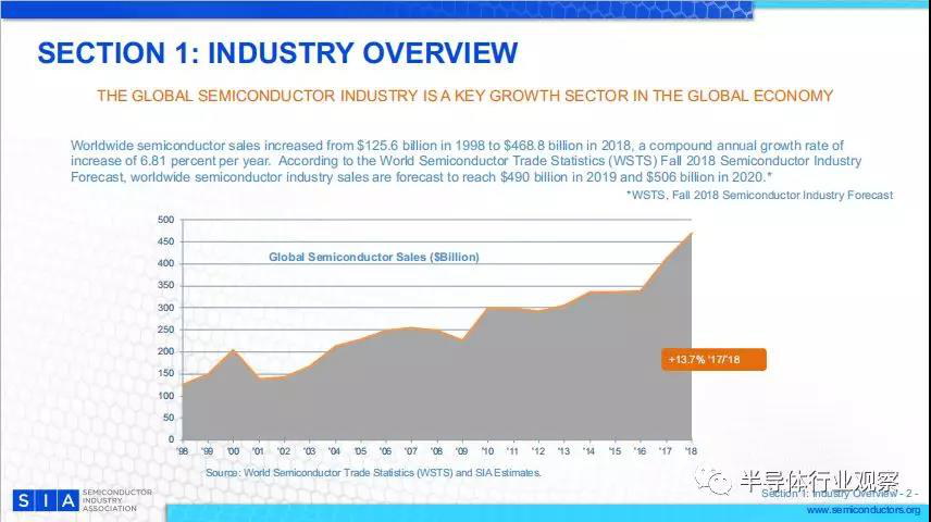 全球半導(dǎo)體銷售額從1998年的1256億美元增加到2018年的4688億美元,復(fù)合年增長率為每年6.81%。 根據(jù)世界半導(dǎo)體貿(mào)易統(tǒng)計(jì)(WSTS)2018年秋季半導(dǎo)體行業(yè)預(yù)測,預(yù)計(jì)2019年全球半導(dǎo)體行業(yè)銷售額將達(dá)到4900億美元,2020年將達(dá)到5060億美元。(*WSTS,2018年秋季半導(dǎo)體行業(yè)預(yù)測)