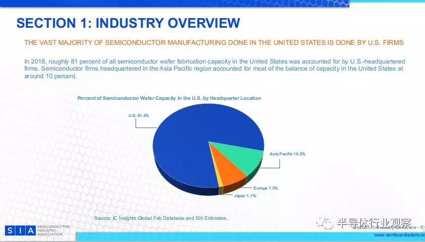 2018年,總部位于美國的公司占了美國半導(dǎo)體晶圓產(chǎn)能的81%??偛课挥趤喬貐^(qū)的半導(dǎo)體公司占美國產(chǎn)能約占10%。