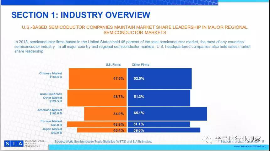 2018年,總部設(shè)在美國的半導(dǎo)體公司占據(jù)了整個半導(dǎo)體市場的45%,是所有國家半導(dǎo)體行業(yè)中最多的。在所有主要國家和地區(qū)的半導(dǎo)體市場中,美國公司保持了銷售市場份額的領(lǐng)先地位。