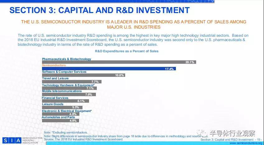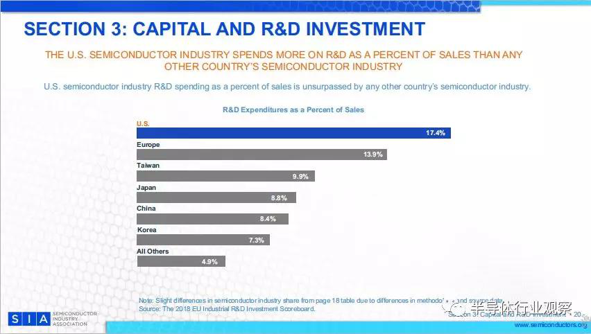 美國半導(dǎo)體工業(yè)的研發(fā)支出在主要的高科技產(chǎn)業(yè)中是最高的?;?/span>2018年歐盟工業(yè)R&D記分牌,美國半導(dǎo)體產(chǎn)業(yè)在研發(fā)支出占銷售額百分比而言,僅次于美國制藥和生物技術(shù)行業(yè)。數(shù)據(jù)顯示,美國半導(dǎo)體的研發(fā)投入占比為17.4%%。