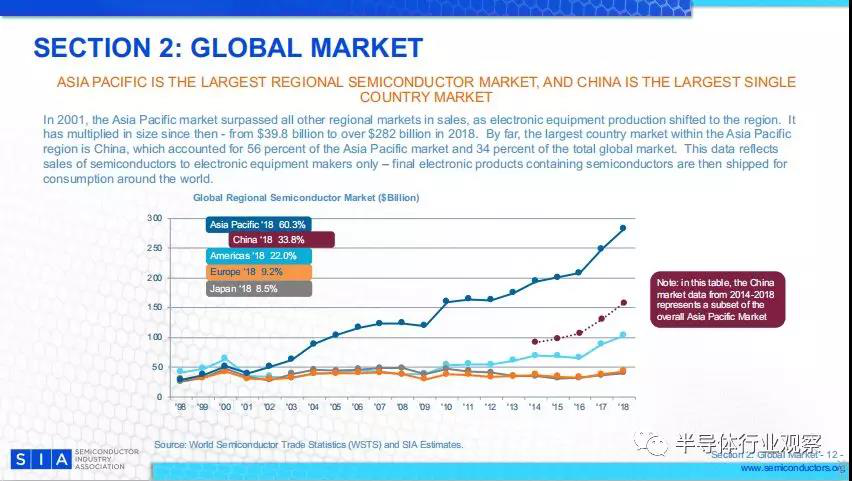 2001年,隨著電子設(shè)備生產(chǎn)轉(zhuǎn)移到亞太地區(qū)市場,該地區(qū)在銷售方面超過了所有其他區(qū)域市場。也就是從那時起,它的規(guī)模成倍增長:從398億美元增加到2018年超過2820億美元。