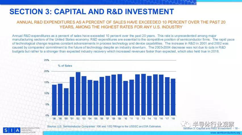 在過去的20年里,研發(fā)支出占銷售額的比例已經(jīng)超過了10%。這一比例在美國經(jīng)濟(jì)的主要制造業(yè)部門中是前所未有的。研發(fā)費(fèi)用對半導(dǎo)體企業(yè)的競爭地位至關(guān)重要??焖俚募夹g(shù)變革要求在工藝技術(shù)和設(shè)備能力方面不斷進(jìn)步。2001年和2002年的研發(fā)增長是由于公司在行業(yè)不景氣的情況下對未來技術(shù)的承諾。2003至2004年的下降并不是由于研發(fā)預(yù)算的削減,而是因?yàn)樾袠I(yè)復(fù)蘇強(qiáng)于預(yù)期,2018年也是如此。