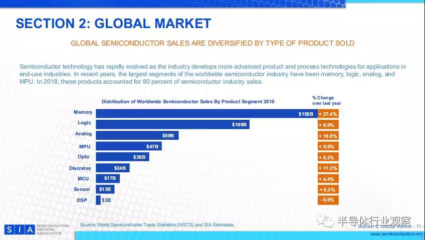 隨著半導(dǎo)體工業(yè)發(fā)展出更先進(jìn)的產(chǎn)品和工藝技術(shù),在工業(yè)終端應(yīng)用中,半導(dǎo)體技術(shù)得到了迅速的發(fā)展。最近幾年,世界范圍內(nèi)的半導(dǎo)體工業(yè)一直是存儲器、邏輯、模擬和MPU。2018年,這些產(chǎn)品占半導(dǎo)體行業(yè)銷售額的80%。