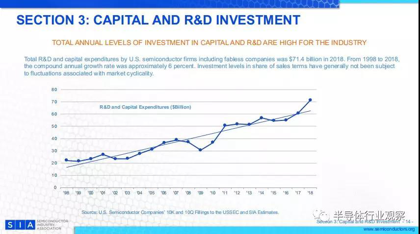2018年,包括fabless公司在內(nèi)的美國半導(dǎo)體公司的研發(fā)和資本支出總額為714億美元。從1998年到2018年,復(fù)合年增長率約為6%。投資占銷售的份額一般不受與市場周期性有關(guān)的波動的影響。