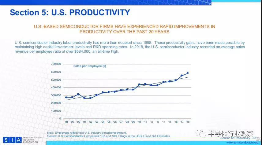 自1998年以來,美國半導(dǎo)體工業(yè)的勞動生產(chǎn)率翻了一番多。這些生產(chǎn)力的提高是通過保持高資本投資水平和研發(fā)支出率來實(shí)現(xiàn)的。數(shù)據(jù)顯示,2018年,美國半導(dǎo)體行業(yè)平均每名雇員的銷售收入超過584,000美元,創(chuàng)歷史新高。