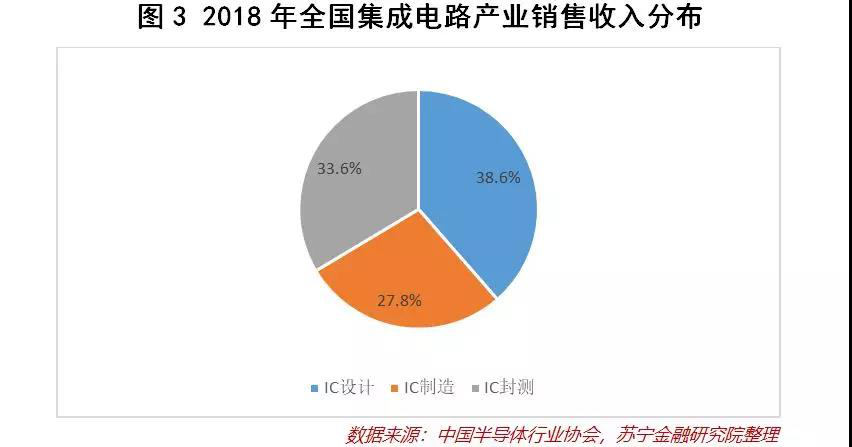 其中,IC設(shè)計(jì)、制造和封測(cè)三足鼎立。IC設(shè)計(jì)為2519.3億元,占比38.6%;IC制造為1818.2億元,占比27.8%;IC封測(cè)為2193.9億元,占比33.6%(參見(jiàn)圖3)。