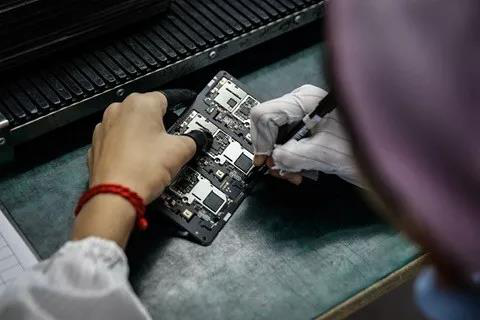 2015年12月24日,廣東東莞,工作人員正在對(duì)手機(jī)主板進(jìn)行標(biāo)記。芯片的核心是集成電路。華為在芯片領(lǐng)域受限,體現(xiàn)的是中國(guó)集成電路被美國(guó)“卡脖子”的困境。圖/視覺(jué)中國(guó)