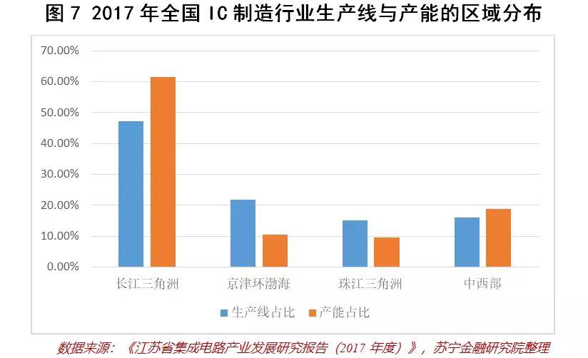 與IC設(shè)計(jì)業(yè)相比,中國(guó)IC制造業(yè)集中度相對(duì)較高。其中,長(zhǎng)三角地區(qū)有50條,占47.2%,產(chǎn)能(折合8英寸,下同)占比61.4%;京津環(huán)渤海地區(qū)有23條,占21.7%,產(chǎn)能占比10.4%;珠三角地區(qū)有16條,占15.1%,產(chǎn)能占比9.5%;中西部地區(qū)有17條,占16%,產(chǎn)能占比18.7%。