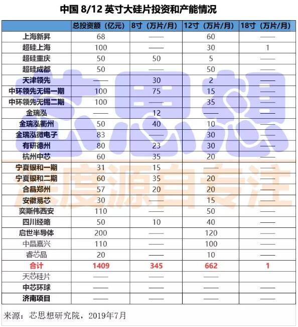 芯思想研究院調(diào)研發(fā)現(xiàn),目前宣布的12英寸硅片項(xiàng)目多達(dá)20個(gè),根據(jù)各家公司公布情況來看,總投資金額超過1400億,12英寸硅片總規(guī)劃月產(chǎn)能到2023年前后合計(jì)超過650萬片,如果加上天芯硅片、中芯環(huán)球、濟(jì)南項(xiàng)目,12英寸硅片總規(guī)劃月產(chǎn)能將可能高達(dá)800萬片,約是2018年全球12英寸硅片月需求的2倍。
