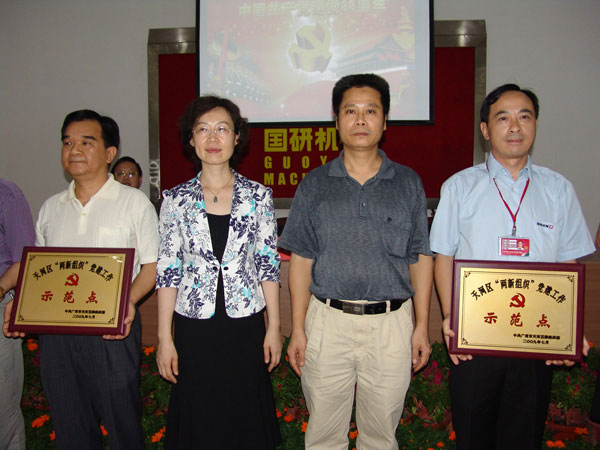 區(qū)委常委、組織部部長潘文捷、廣州市組織部處長邱培潘為國研機械授予黨建示范點匾牌并合影