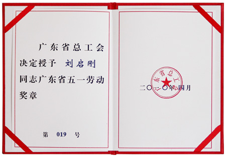 廣東省委、省政府授予劉啟剛同志廣東省五一勞動獎?wù)?/p>